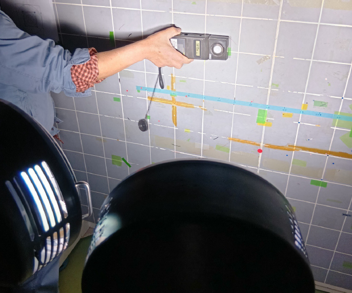 测量时,使其相对于墙面保持水平并成直角。墙面上绘有网格状的线条,按照一定间隔进行测量,通过在多个位置进行照度测量,计算得出平均照度。